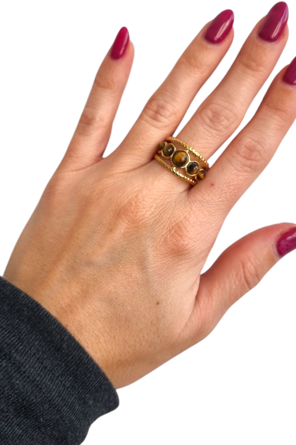 El Anillo Desierto captura la esencia de los paisajes áridos y majestuosos, con una franja de acero adornada con piedras en tonos marrón tierra que evocan la inmensidad del horizonte del desierto. Su diseño minimalista y sutil aporta un toque de elegancia natural, perfecto para quienes buscan un estilo sofisticado pero discreto.