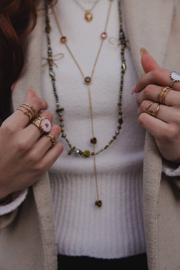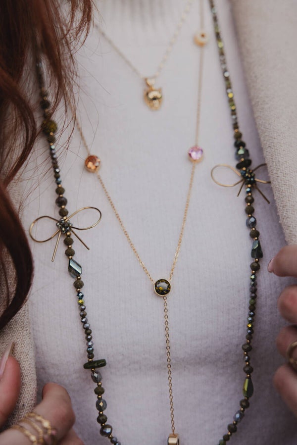 El Collar Linda es una joya que habla por sí sola. De diseño sofisticado, destaca por su largo de piedras verdes brillantes que aportan luz, frescura y mucha presencia. Ideal para ocasiones especiales donde la distinción y el buen gusto son protagonistas.