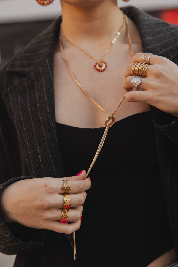 El Collar Enudo es una pieza sofisticada y atemporal que aporta distinción a cualquier look. Con su diseño en forma de Y, su nudo central se convierte en el protagonista de una caída elegante y fluida que realza el cuello con mucha clase. Ideal para eventos especiales, noches con estilo o para elevar un outfit sencillo con un toque dorado y chic.