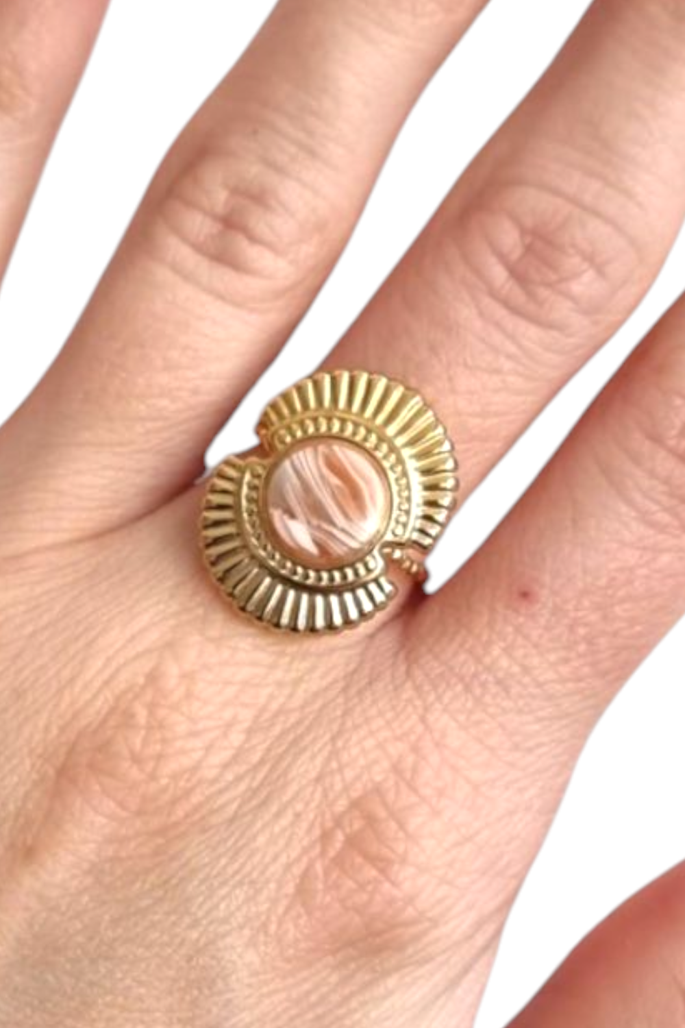 El Anillo Conchita es una joya inspirada en la belleza natural de las conchas marinas, evocando la frescura y serenidad del océano. Su diseño redondo y delicado está protagonizado por una piedra en tonos rosa pastel, que le aporta un aire cálido, suave y sofisticado.