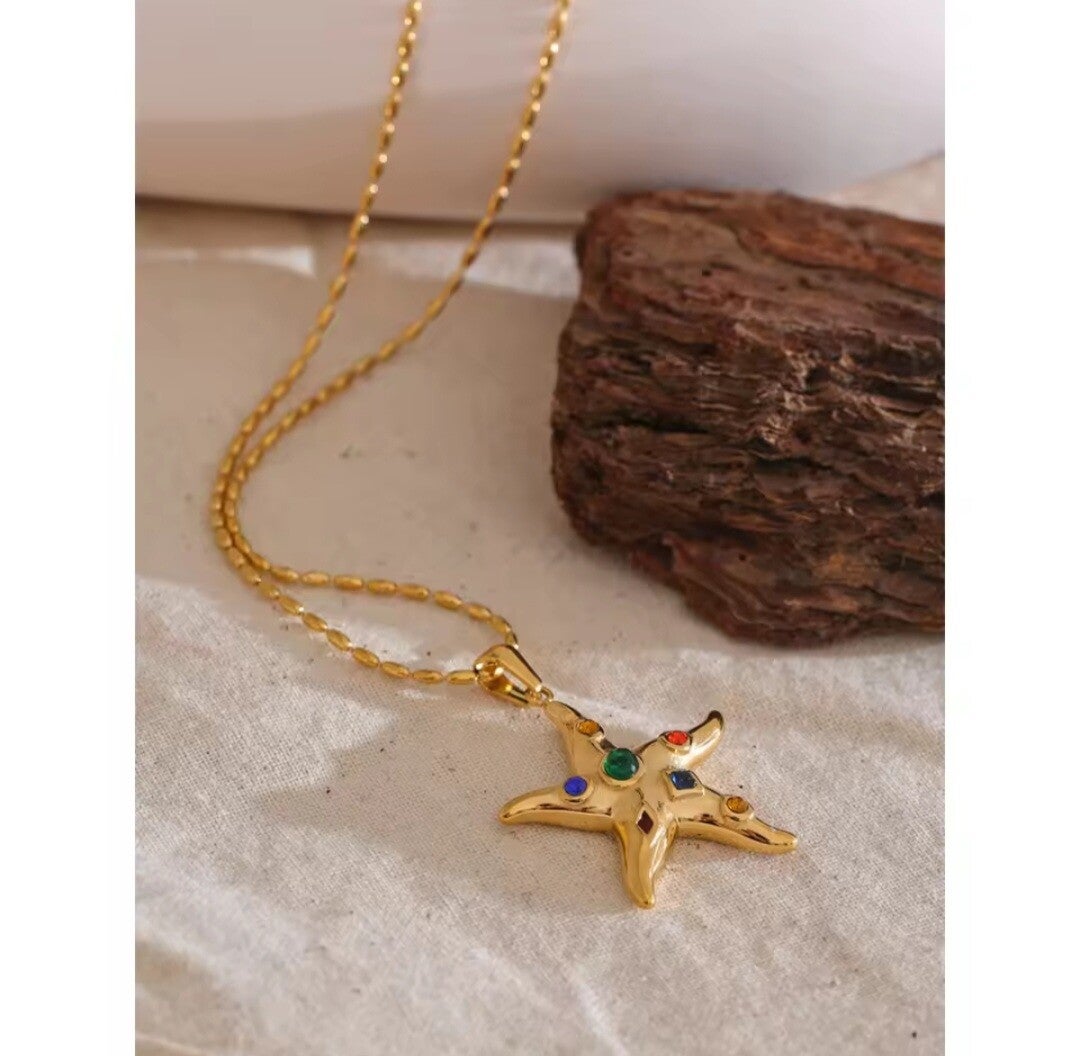 ✔ Joyería casual – Cadena larga y fina con una estrella de mar de piedras coloridas.