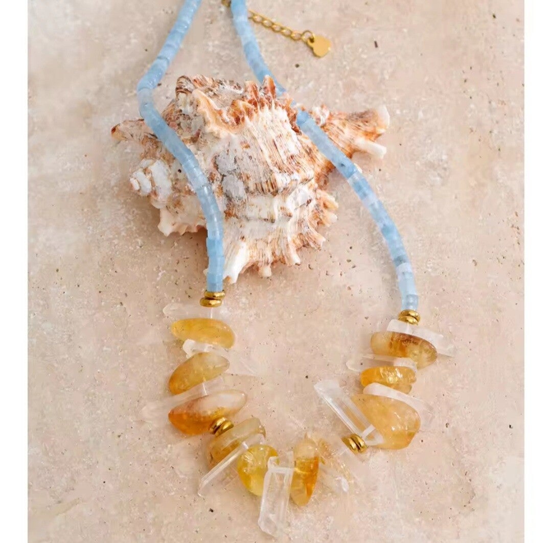 Este collar de 42 cm tiene como protagonista una cadema de piedra, de la que cuelgan cristales naturales en tonos blancos y amarillos.