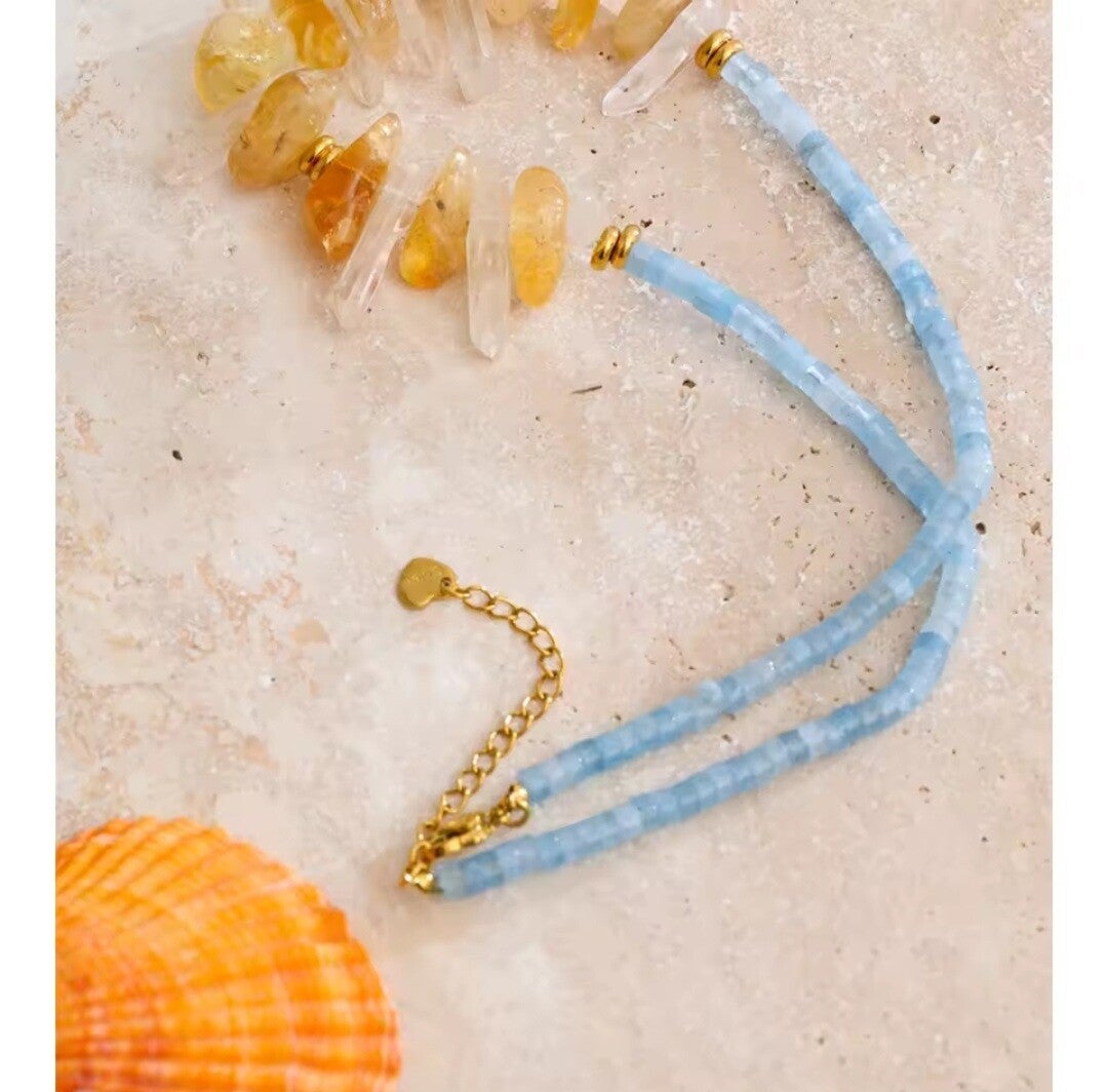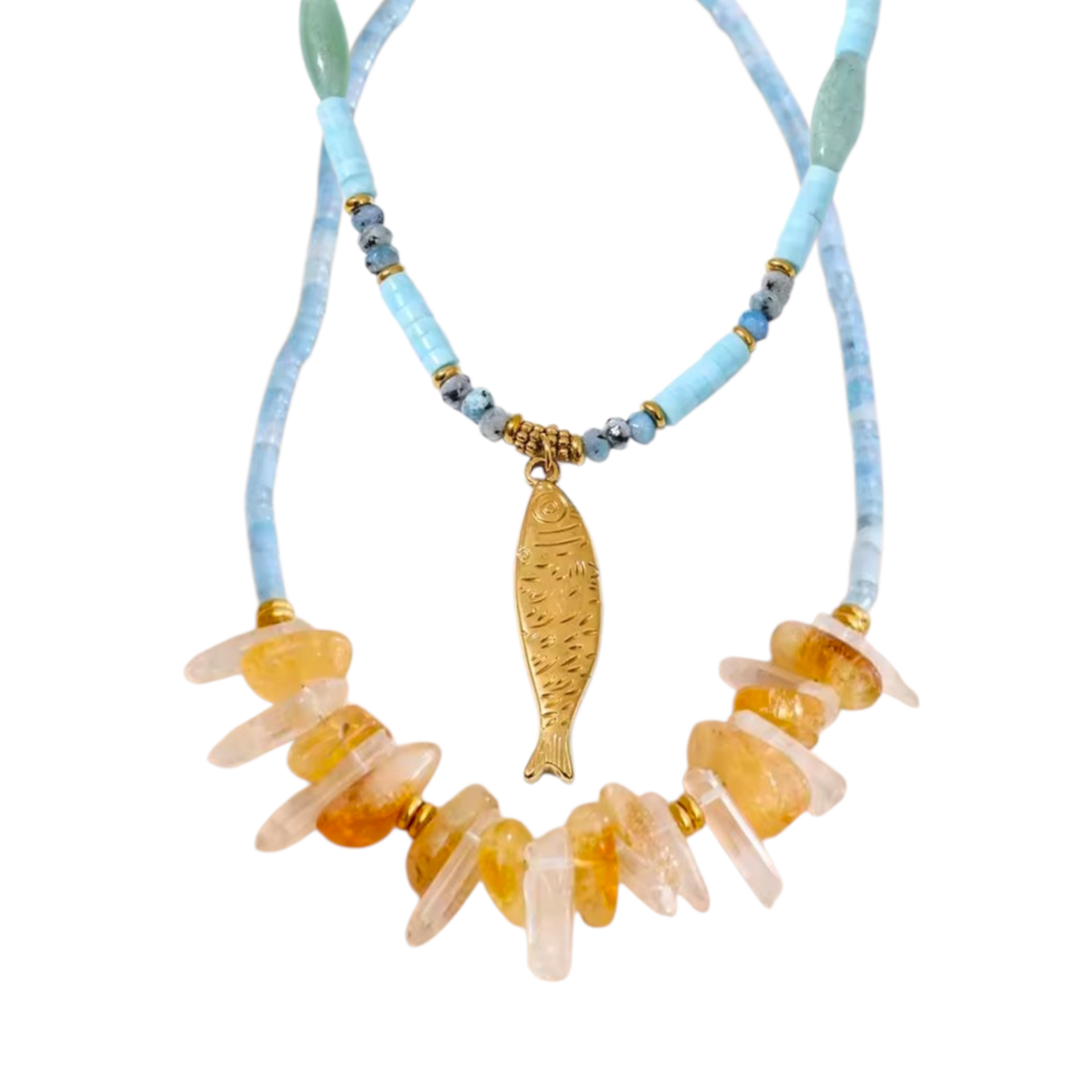 Acompañando estos detalles marinos, el collar incorpora piedras naturales en tonos azul mar de Tenerife y blanco, evocando la pureza y la serenidad del océano.