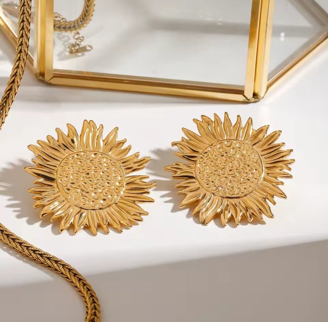 Los Pendientes Luisa son pura alegría convertida en joya. Con forma de girasol, su diseño evoca el espíritu del verano, las vacaciones y los días felices. Realizados en acero inoxidable y bañados en oro de 18K, son resistentes, luminosos y perfectos para elevar cualquier look con un toque floral y dorado.