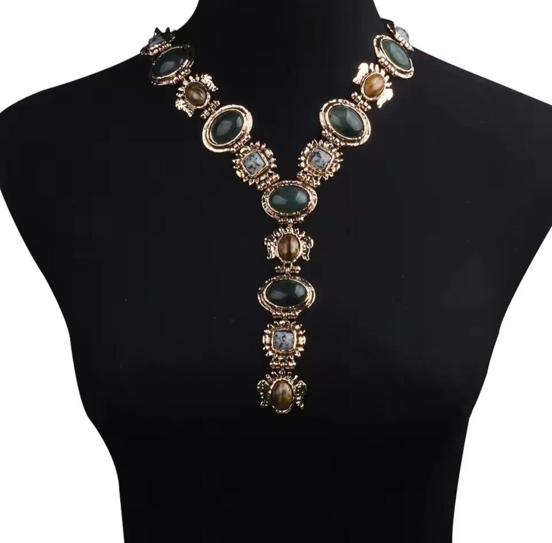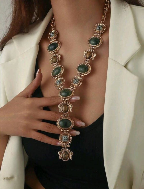 El Collar Vaquero es una joya imponente y elegante que combina resina, piedra y acero inoxidable en un diseño inspirado en la joyería india bohemia de estilo étnico y vintage. Su forma en cascada y su cuidada combinación de materiales le otorgan carácter y originalidad, convirtiéndolo en una pieza que eleva cualquier outfit.