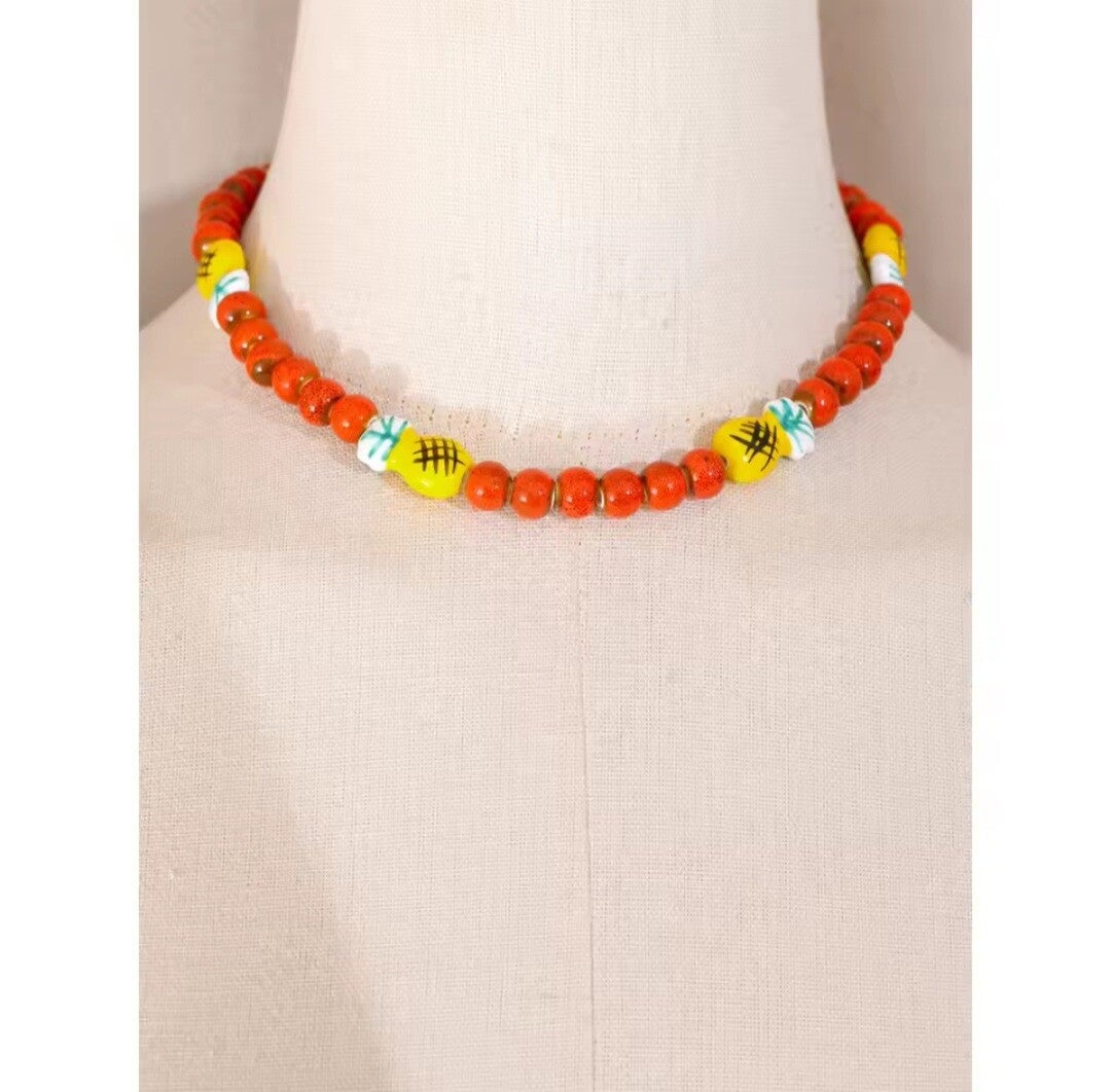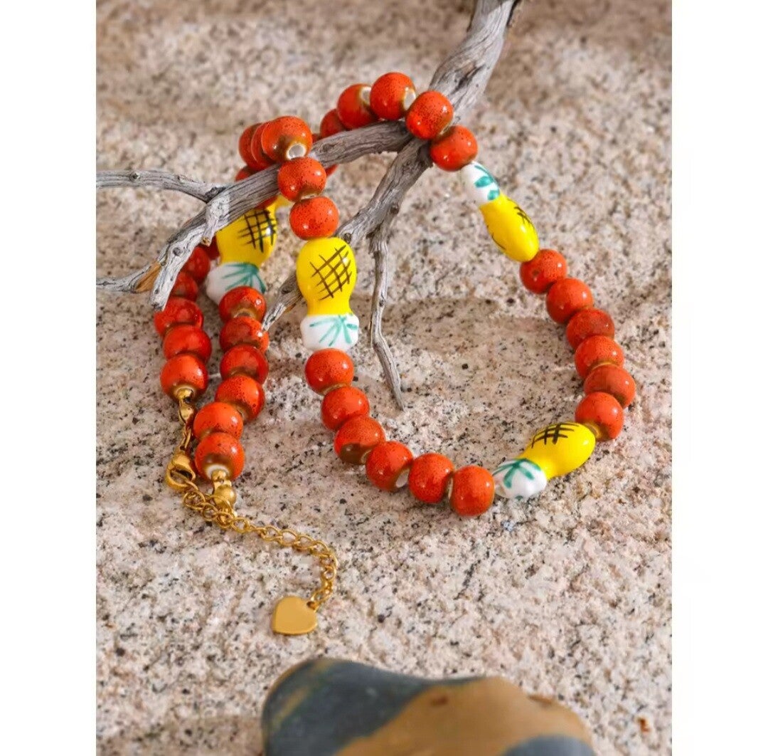 El Collar Colada es una joya hecha a mano que captura la esencia del verano con un giro delicioso. Compuesto por una cadena de cerámica en tonos naranja rojizo y decorado con pequeñas piñas esmaltadas, es el accesorio perfecto para quienes adoran los detalles alegres, originales y llenos de personalidad.