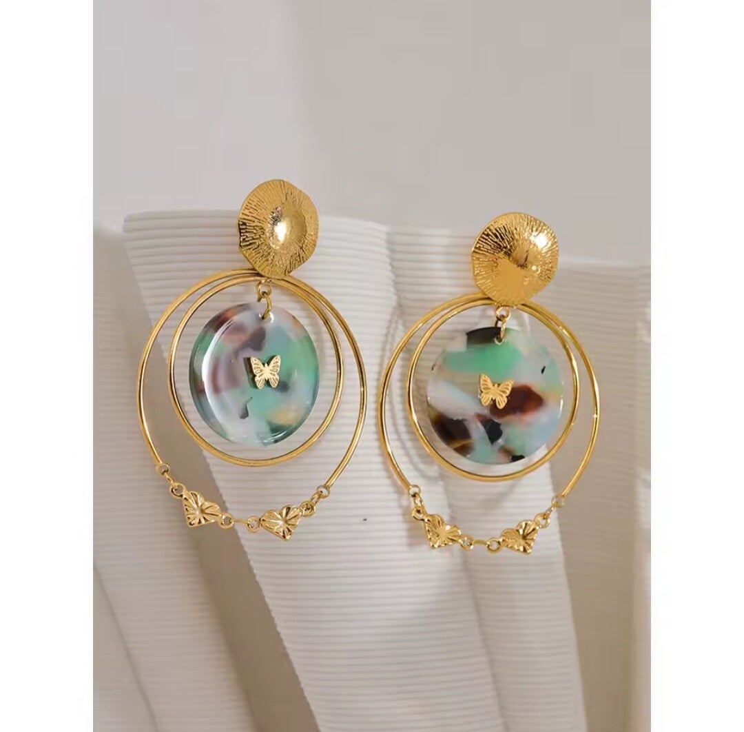 Su diseño de aros colgantes con una mariposa como protagonista evoca la poesía visual del arte asiático. Los colores suaves y armoniosos, inspirados en la estética oriental, hacen de estos pendientes el complemento ideal para destacar con elegancia y sensibilidad.