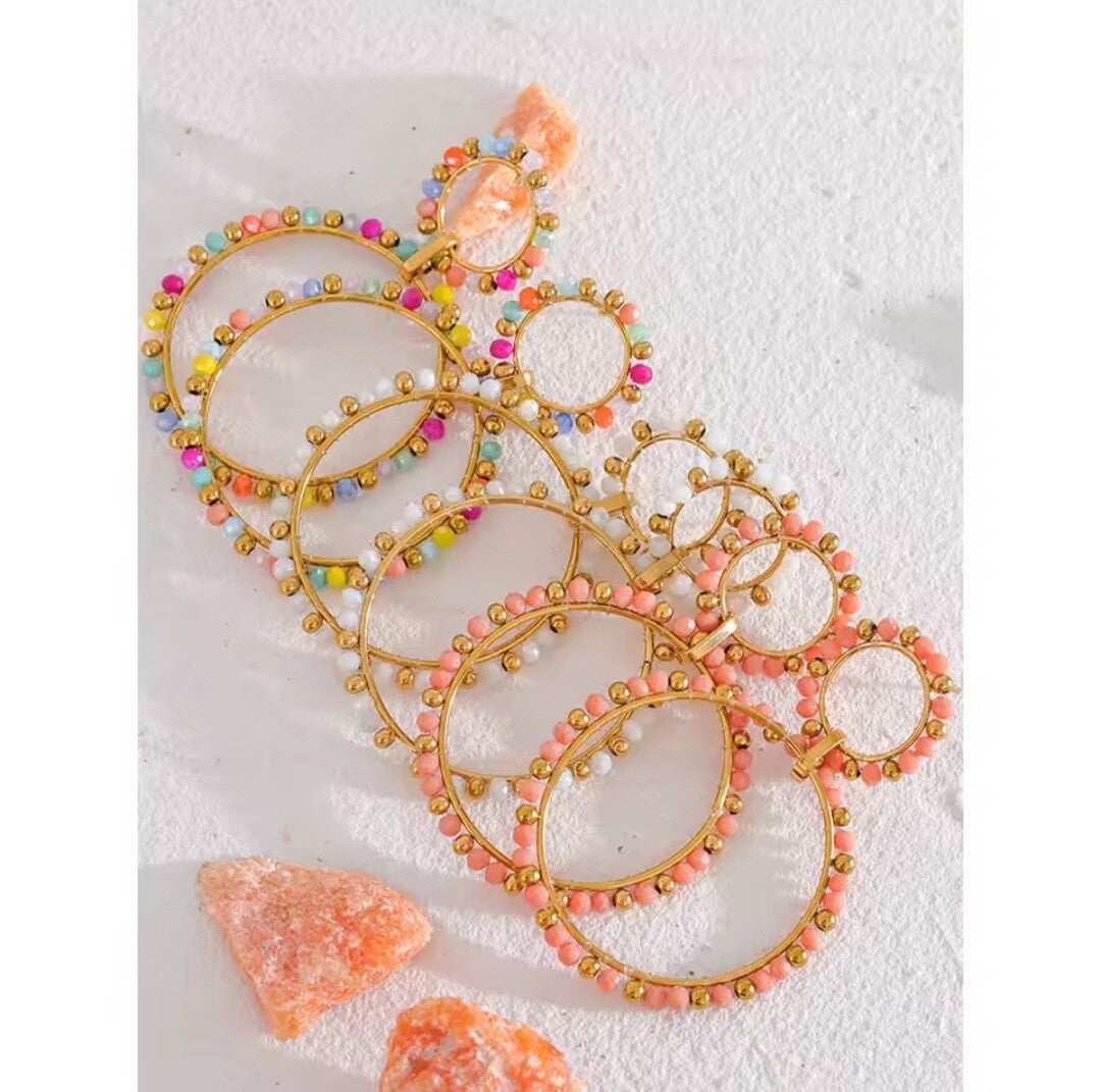 Los Pendientes Grosería son pura actitud. Con un diseño de aros colgantes en acero inoxidable, decorados con cuentas de cristal coloridas hechas a mano, esta joya es una explosión de color y personalidad.