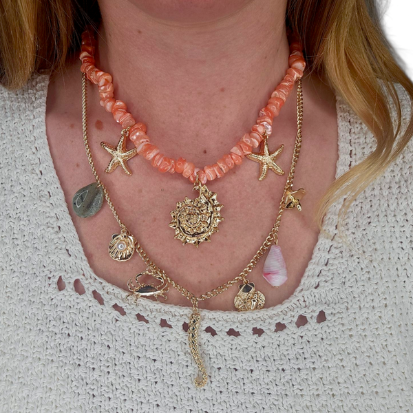 Uno de los collares está formado por piedras coralinas en tonos intensos, adornado con charms marinos que evocan conchas, estrellas de mar y otras maravillas del océano. El otro, más fino y largo, lleva detalles playeros sutiles y delicados que aportan un aire ligero y relajado.