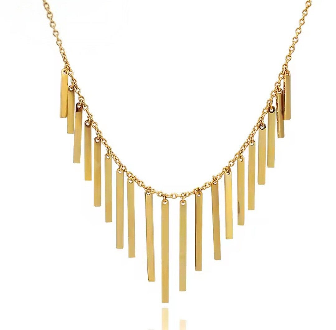 El Collar Salsa es una pieza vibrante, llamativa y con mucho carácter. Diseñado en acero inoxidable dorado, su colgante en forma de gota de agua evoca la fluidez y frescura del verano. Los eslabones anchos le aportan un aire moderno y bohemio, convirtiéndolo en un imprescindible de temporada.