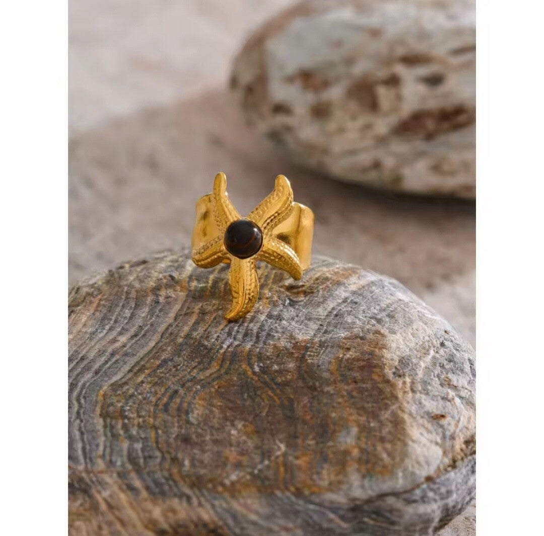 El Anillo Elvis es una joya con personalidad, ideal para quienes buscan destacar con una pieza original, elegante y con alma marina. Su diseño abierto presenta una estrella de mar como protagonista, adornada con una piedra natural de ojo de tigre, creando un equilibrio perfecto entre naturaleza, sofisticación y tendencia.