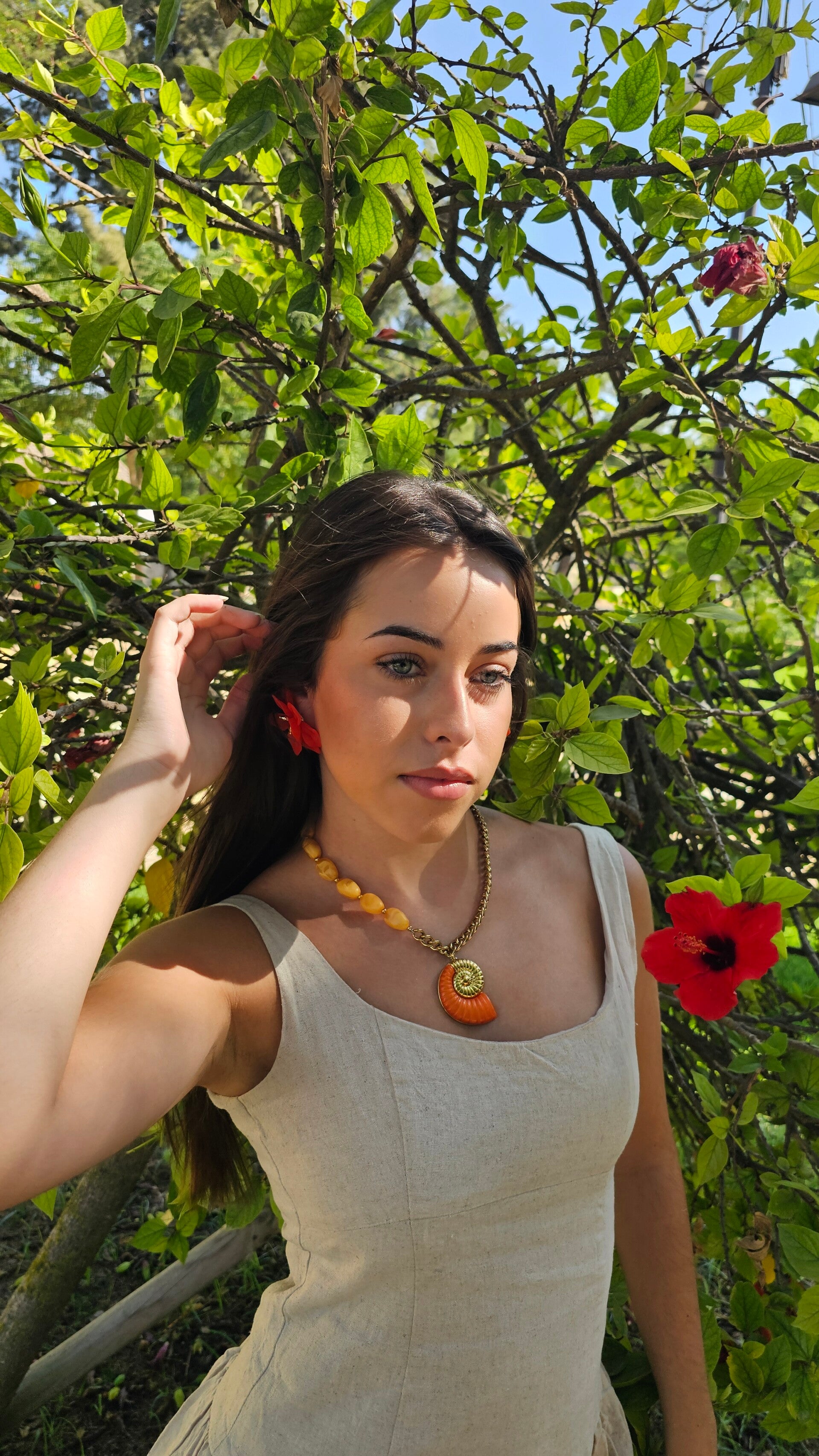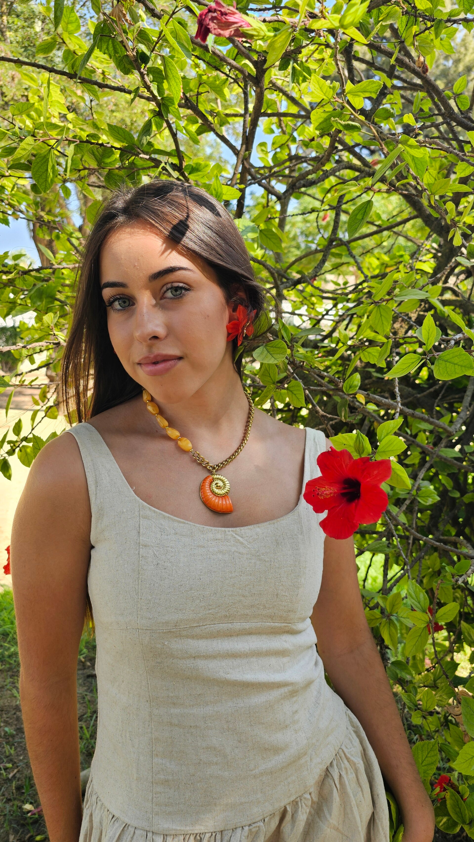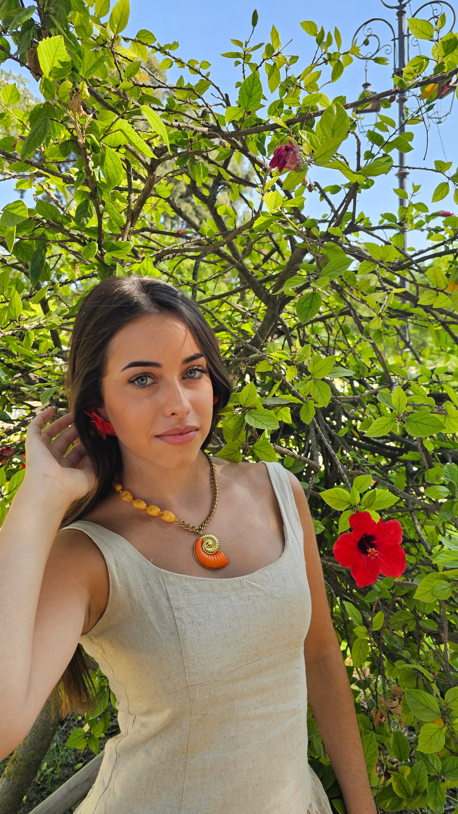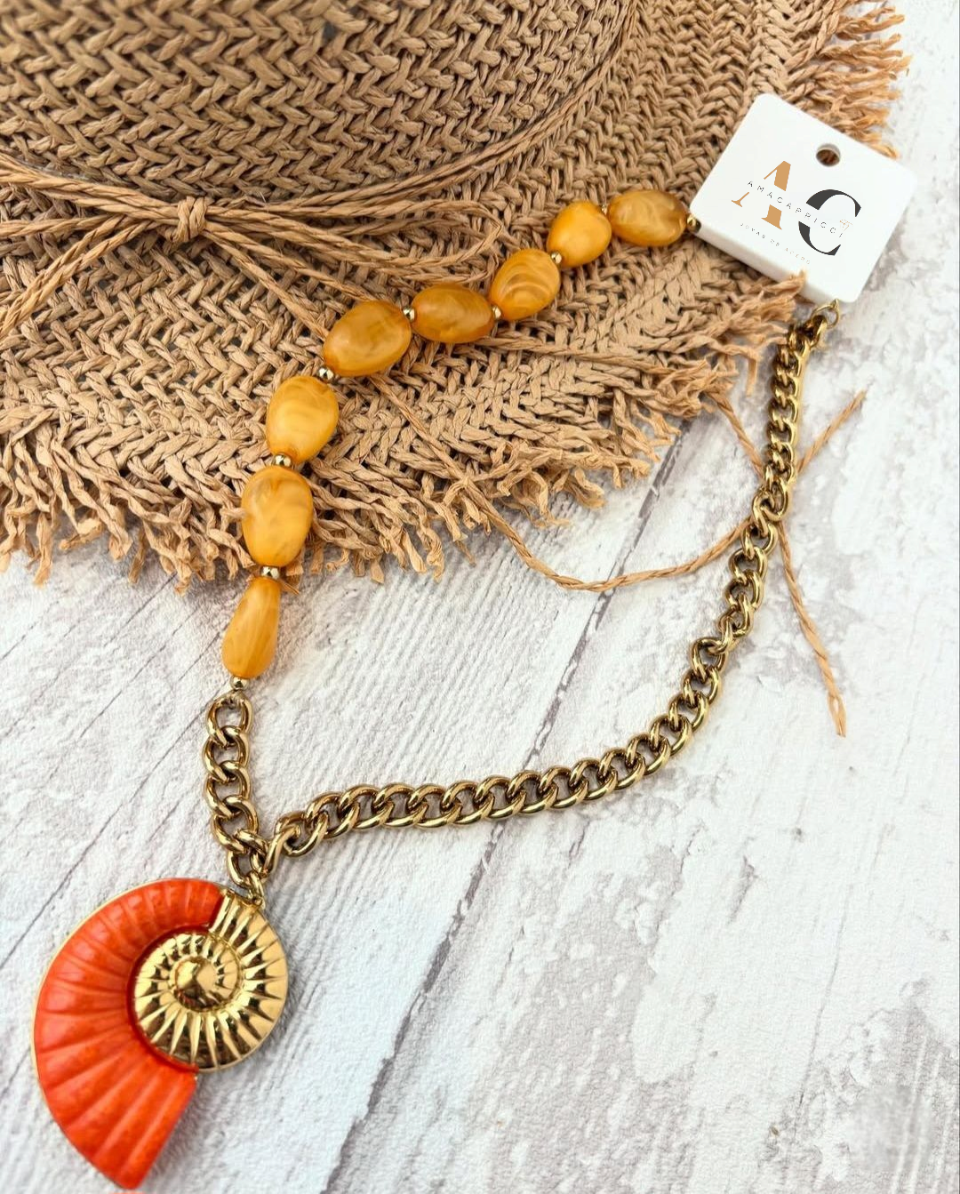 El Collar Adri es una joya con alma, hecha a mano con piedras naturales en dos versiones: naranja vibrante y beige suave, que evocan la calidez del verano y la serenidad de la arena. Su diseño se completa con una caracola protagonista y una elegante cadena de acero inoxidable, creando una combinación única y con mucho encanto.