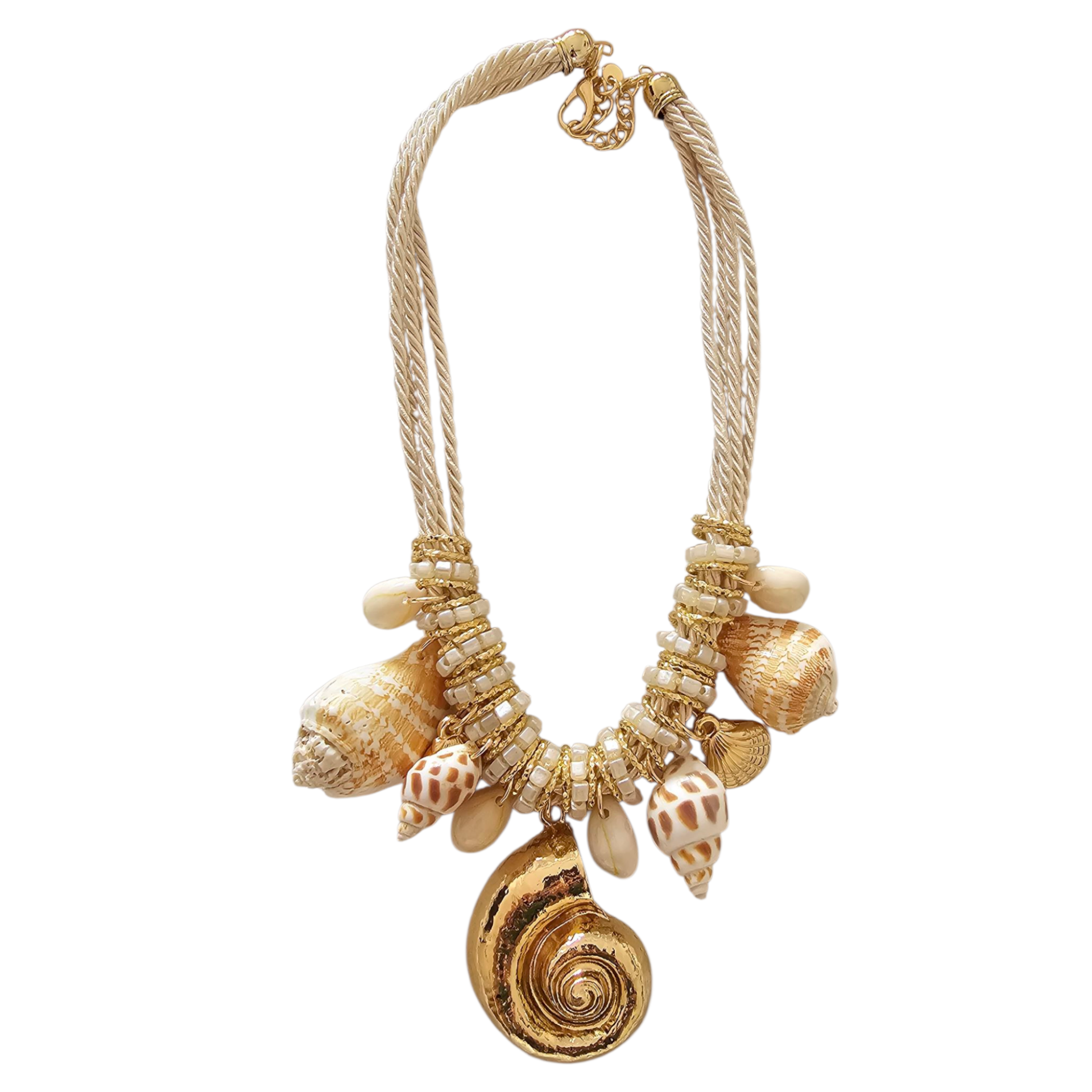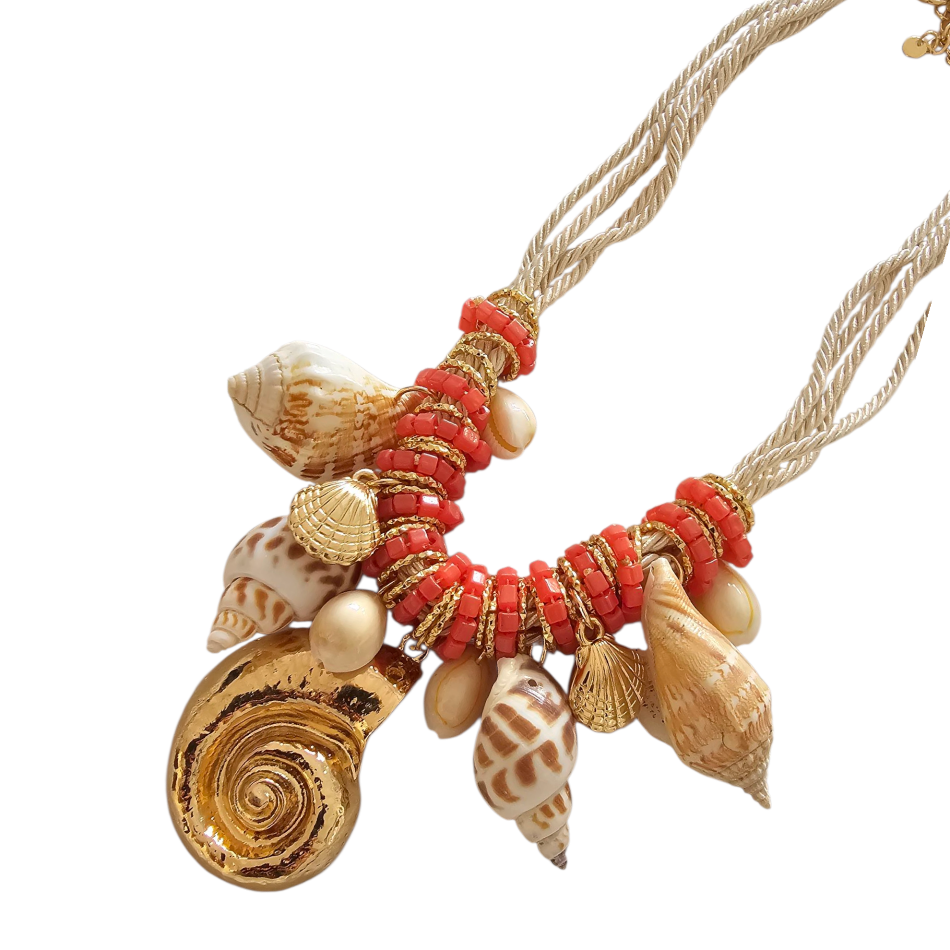 El Collar Diva es una joya original, fresca y rebosante de personalidad. Hecho a mano con tela en tonos rojo, azul y beige, combina charms de acero inoxidable y una caracola protagonista que simboliza el océano, convirtiéndose en el accesorio veraniego por excelencia.