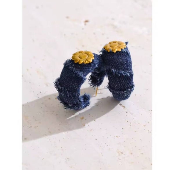 Los Aros Vaqueros son pura personalidad. Su forma en “C” clásica se reinventa con un original revestimiento de tela vaquera y una delicada flor azul creativa, dando vida a unos pendientes únicos, modernos y con mucho carácter.