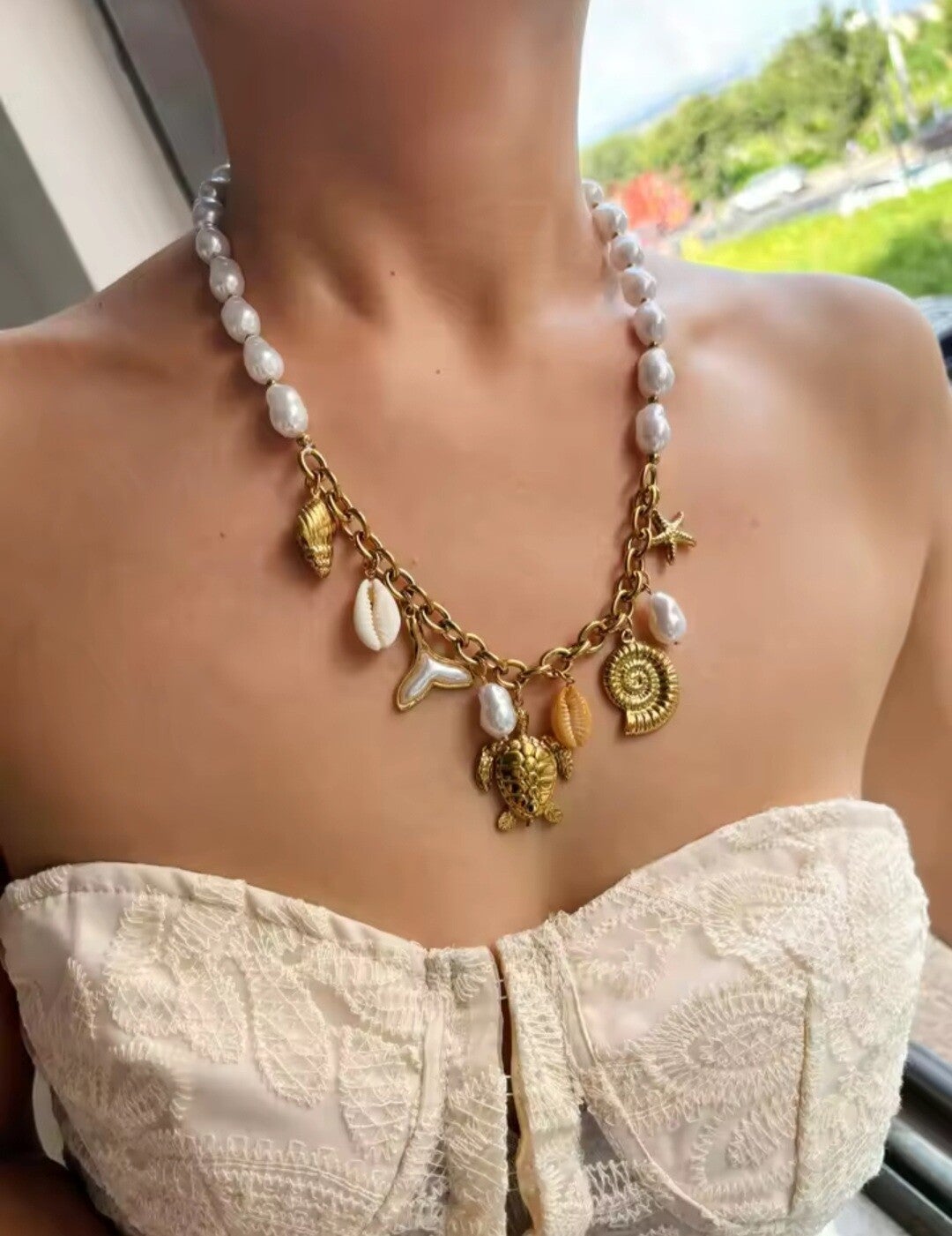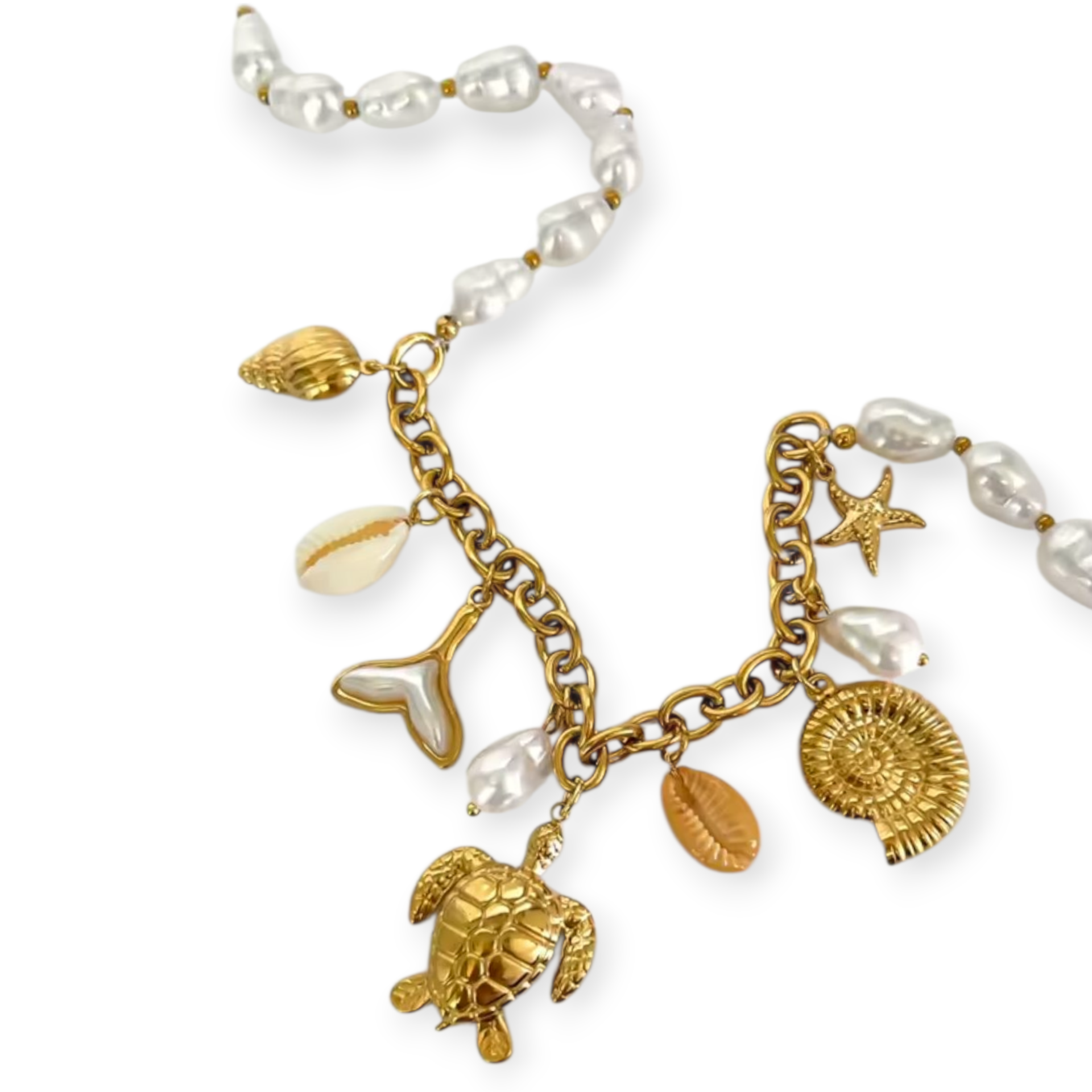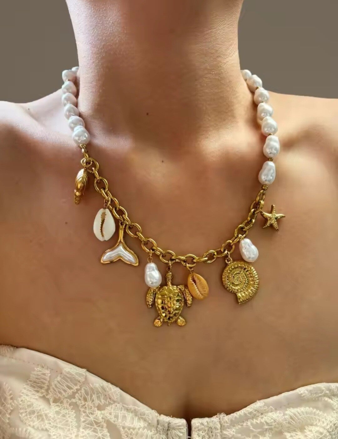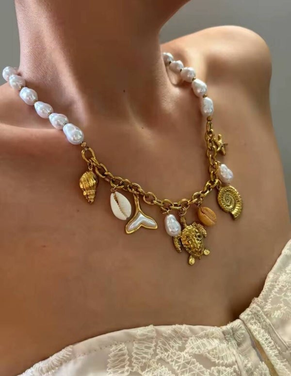 El Collar Yalih es una joya que respira estilo bohemio y frescura mediterránea. Con un diseño ibicenco y veraniego, combina un delicado colgante de acero y perla blanca con elegantes charms de tortuga e inspiraciones marinas, creando una pieza original, romántica y muy especial.