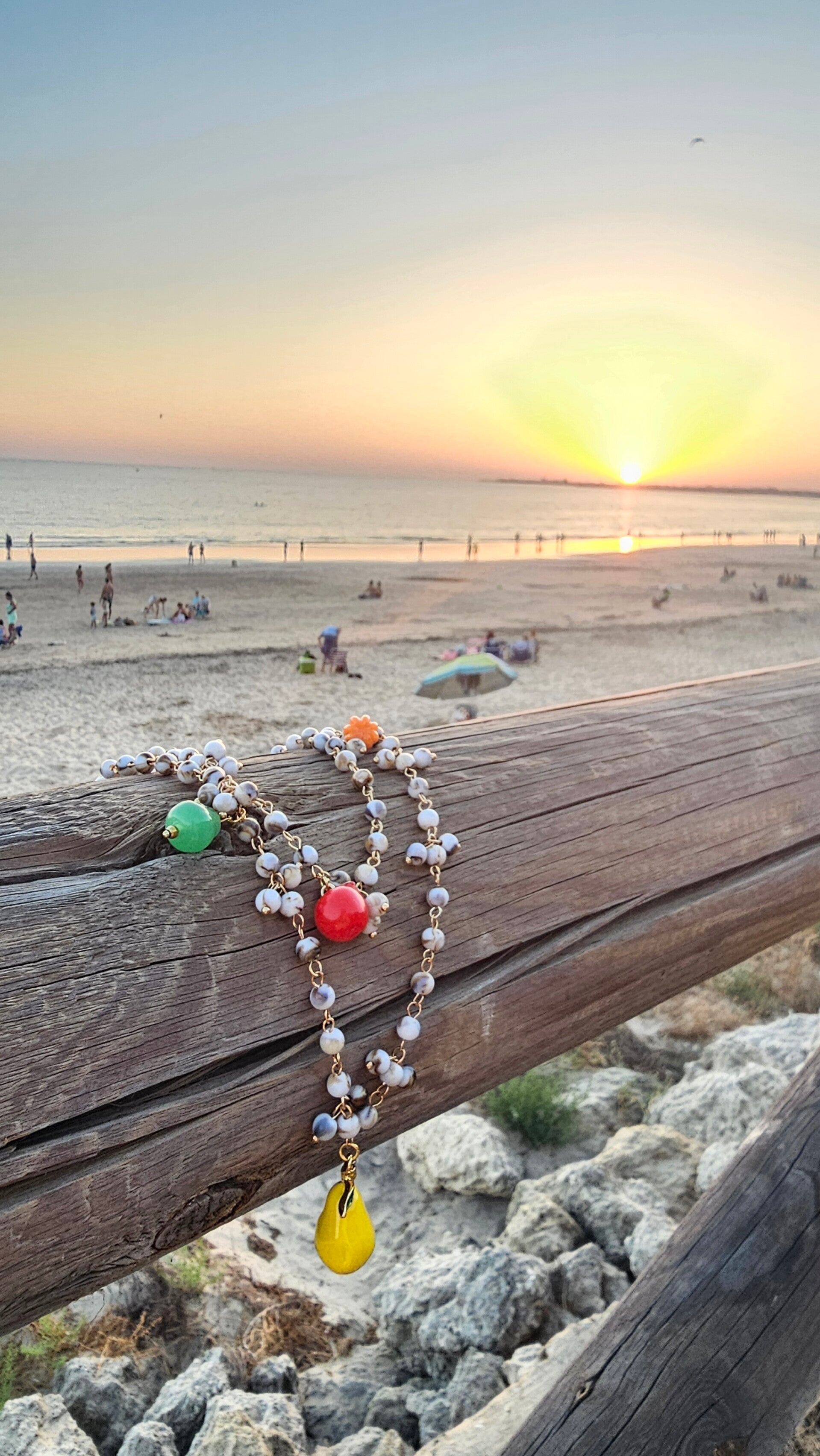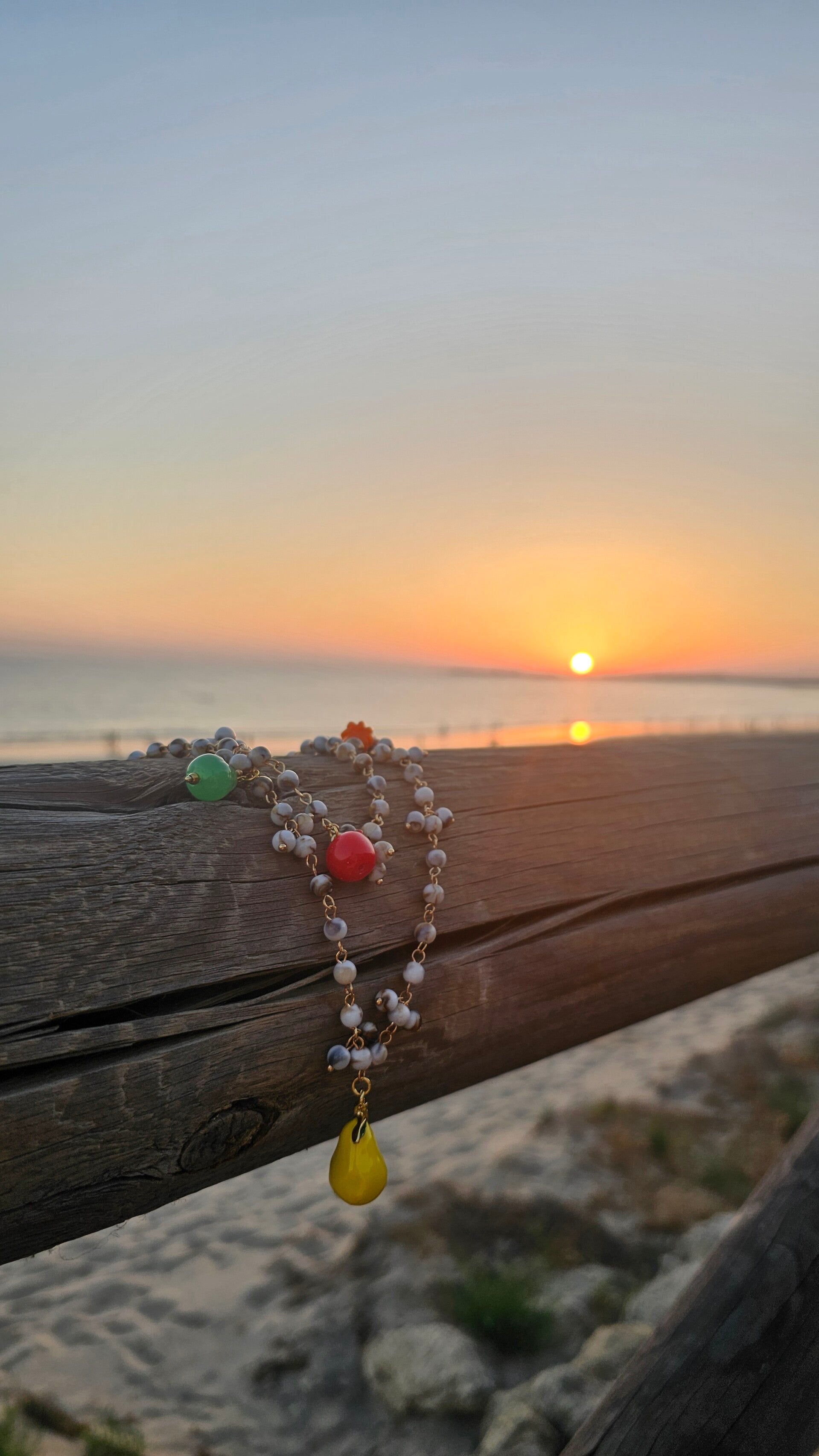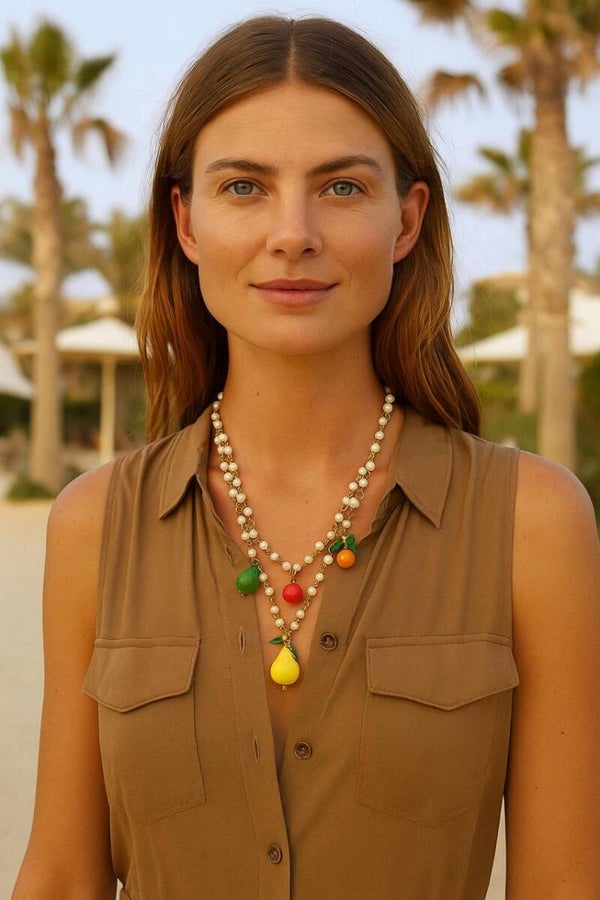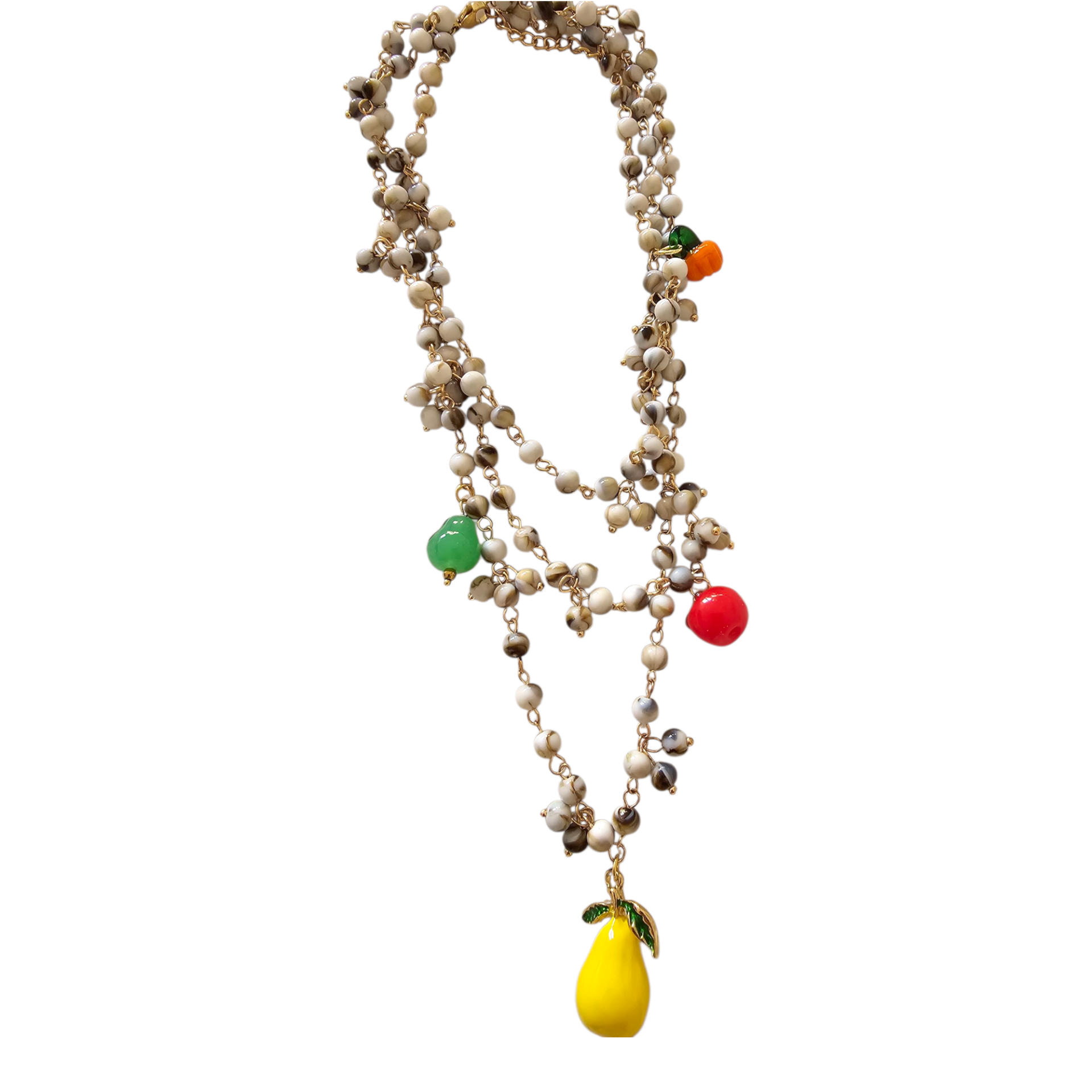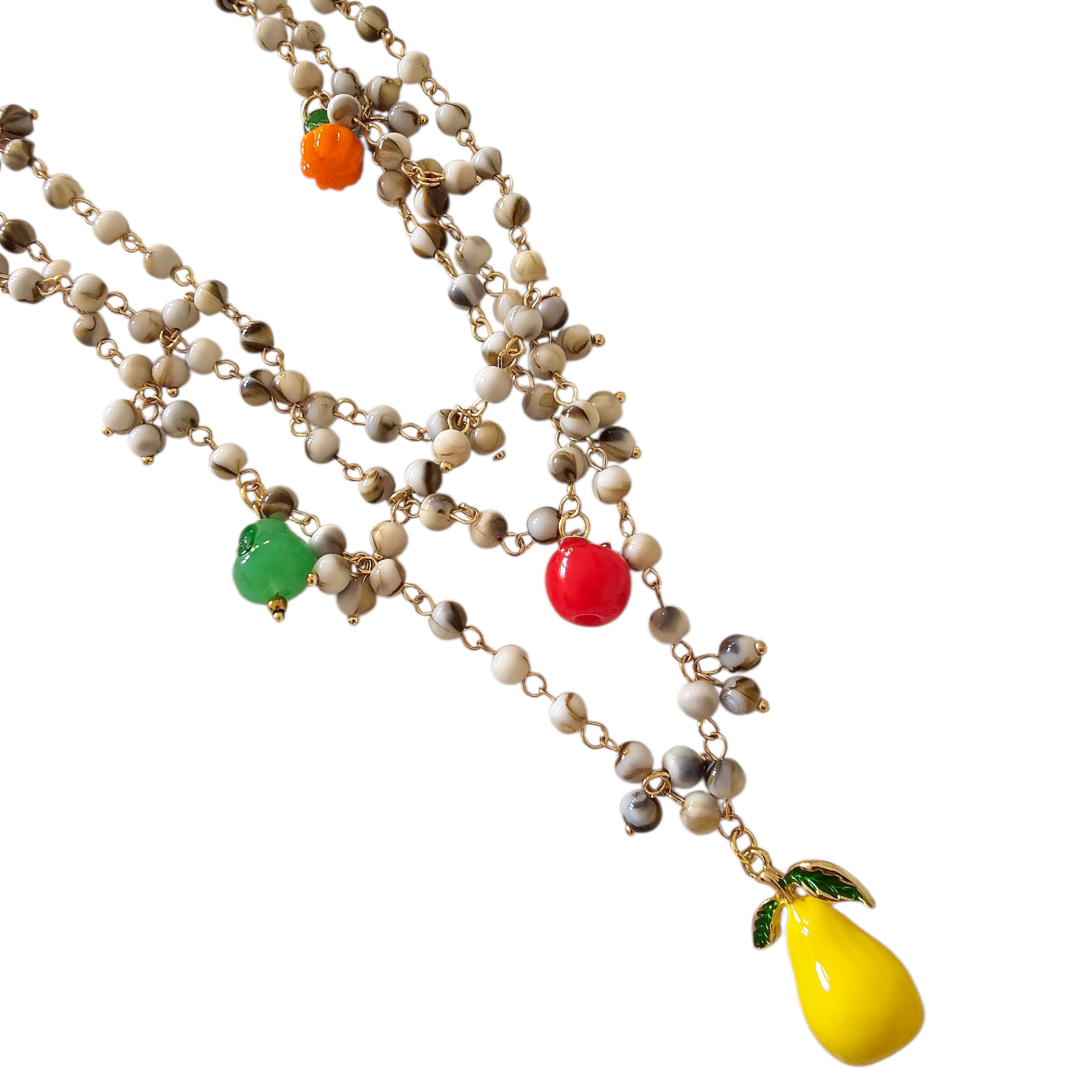 El Collar Tutifruti es una explosión de color, frescura y diversión. Hecho con piedras naturales multicolor y charms decorativos de frutas, esta joya transmite energía positiva y alegría en cada detalle. Es el complemento ideal para destacar en los días soleados y para quienes no temen jugar con su estilo.