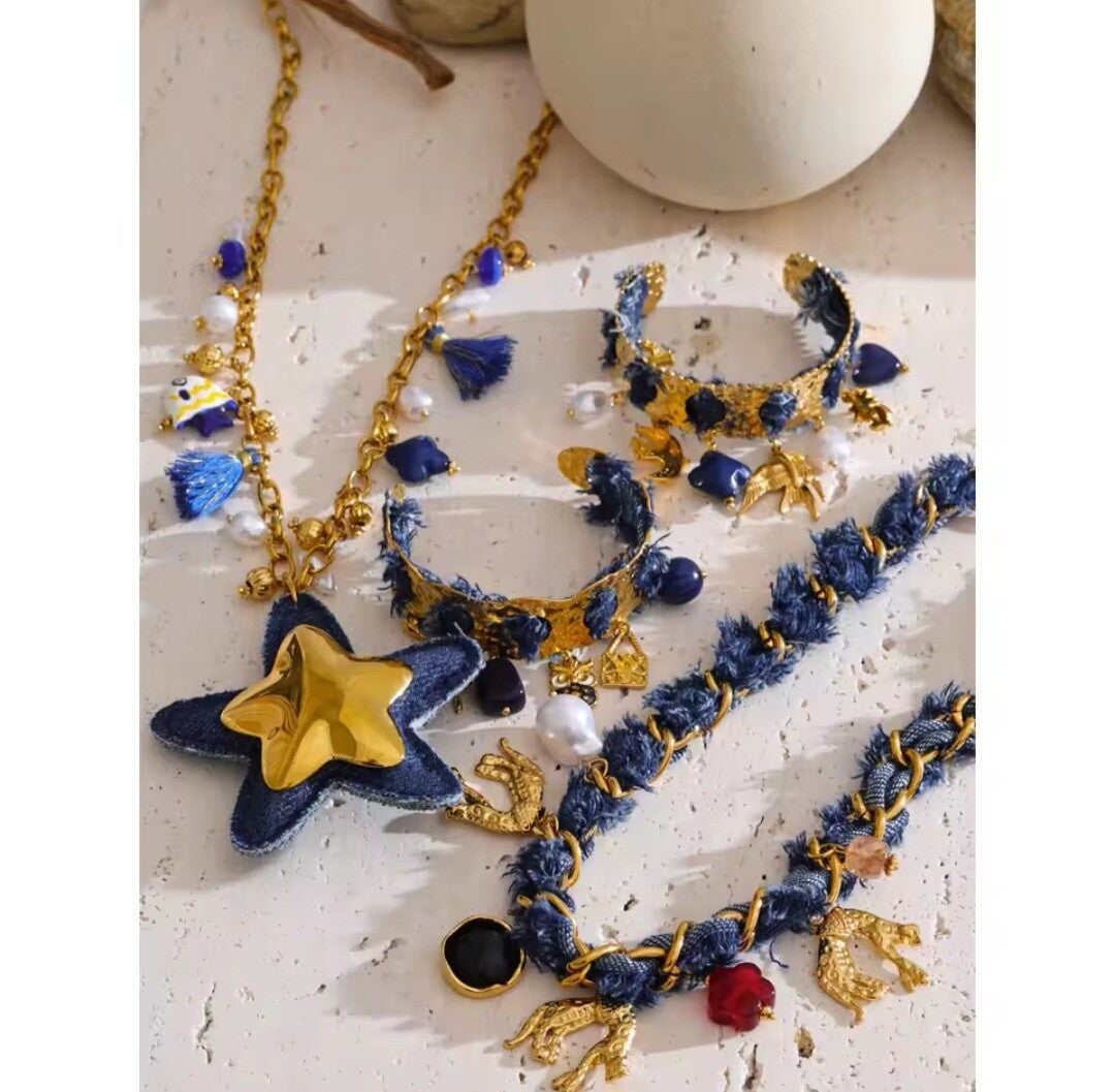 ✔ Material: Denim azul oscuro + charms de acero inoxidable