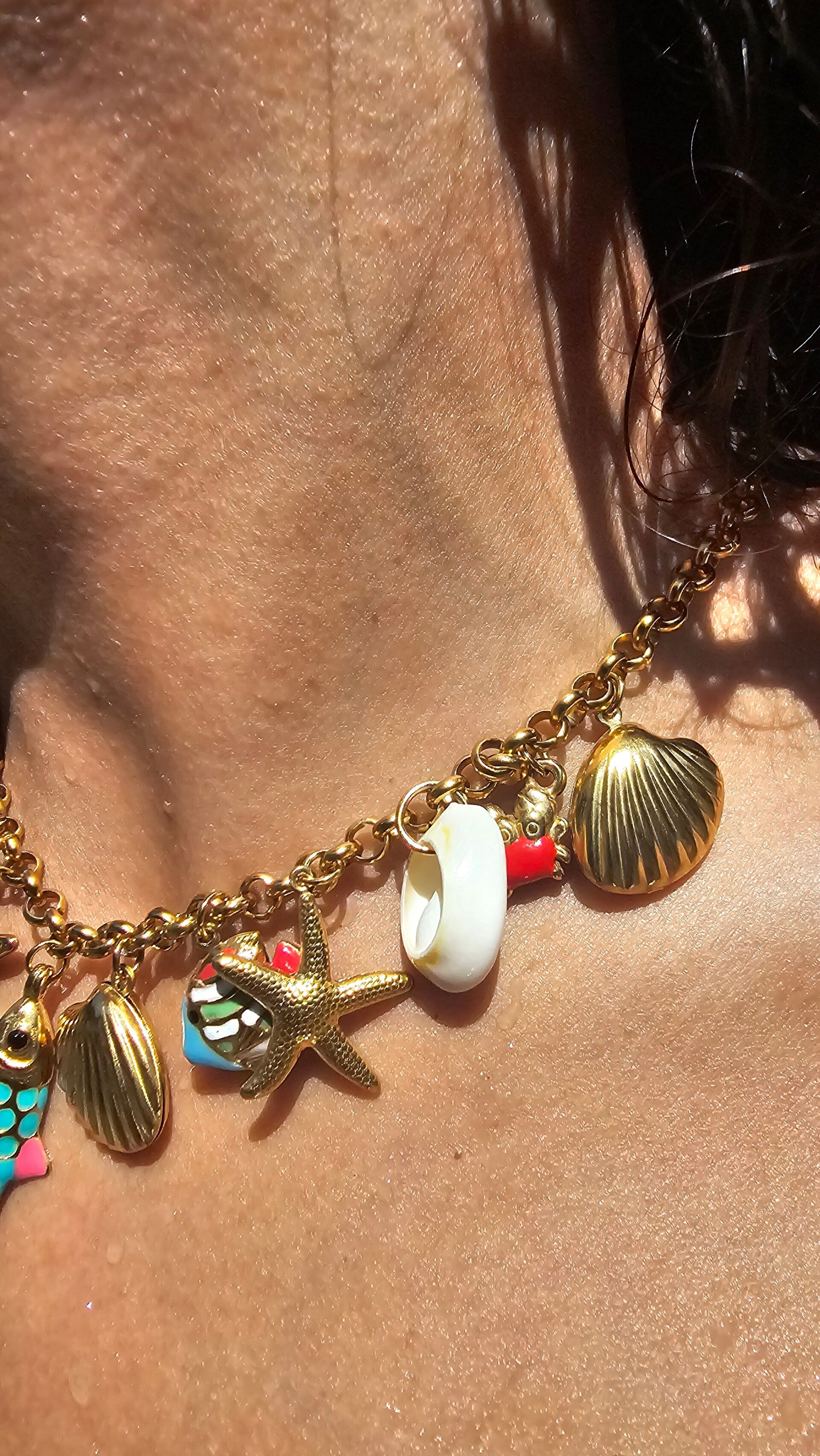 El Collar Pantano es la pieza que transformará tus looks veraniegos con un toque fresco y sofisticado inspirado en el océano. Con su colgante central y delicados charms de cerámica, acompañado de una cadena de acero inoxidable hipoalergénica y resistente al agua, es el accesorio perfecto para tus vacaciones o cualquier plan bajo el sol.