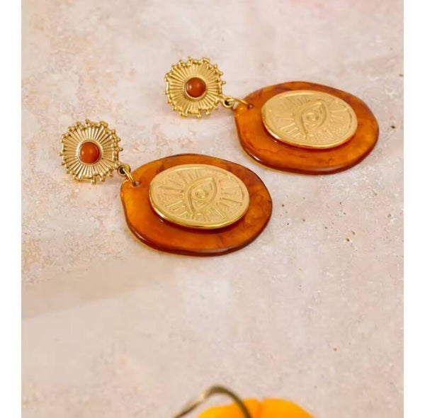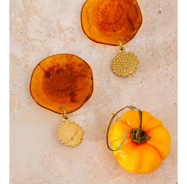 Los Pendientes Malibú son una joya elegante y original, con un diseño colgante en forma de ojo redondo de resina ámbar dorada que simboliza protección y visión interior. Una pieza llamativa y única, ideal para quienes buscan un accesorio con carácter y significado.