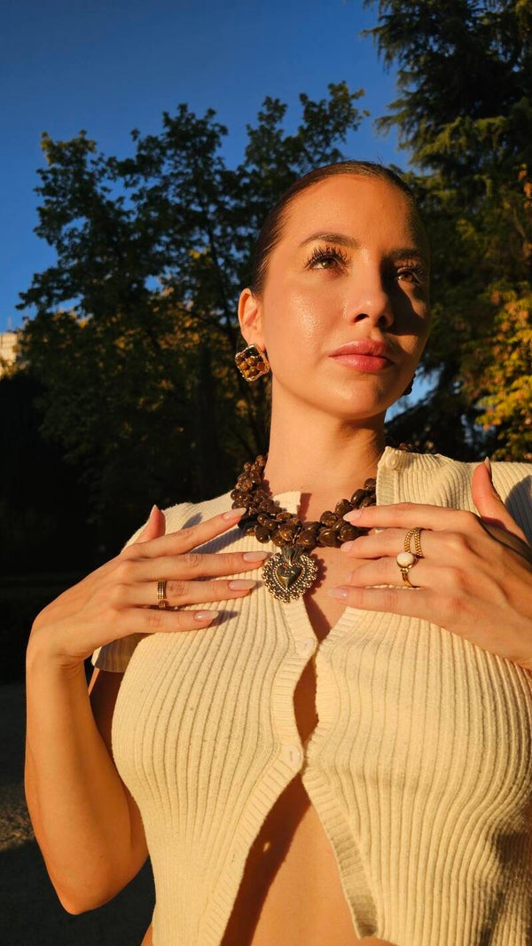 Con una longitud de 42 cm, un dije de 51 mm y un peso de 83 g, el Collar Corina es una pieza impactante y con mucha personalidad, perfecta para quienes buscan accesorios que no pasen desapercibidos.