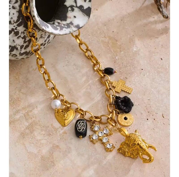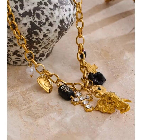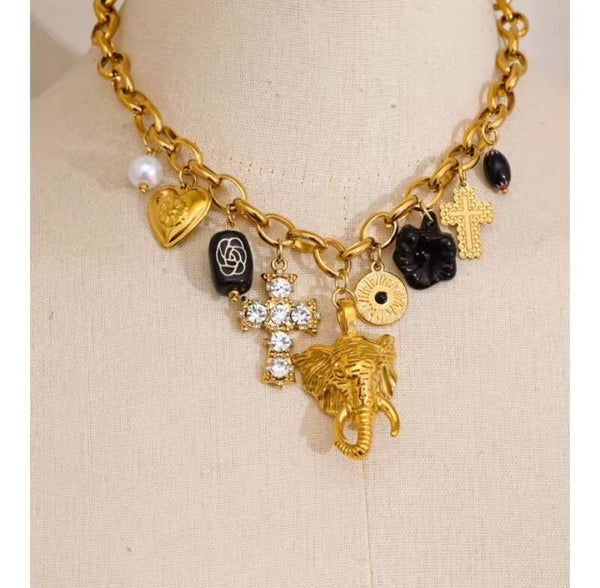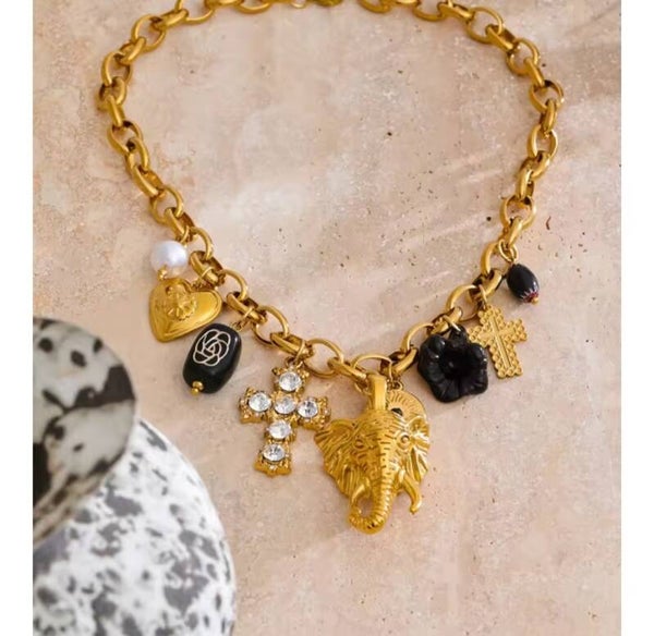 El Collar Safari es una joya impactante y sofisticada que no dejará que pases desapercibida. Con un diseño de eslabones de acero que sostiene una cruz y la imponente cabeza de un elefante dorada, esta pieza refleja poder, elegancia y carácter único. Sus tonos negros le añaden un aire misterioso y distinguido, convirtiéndolo en un accesorio de alta calidad y gran durabilidad.