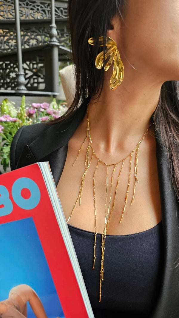 El Collar Luxury es una pieza única que captura todas las miradas. Fabricado en acero inoxidable de 18 quilates, su diseño de flecos en cascada cae con gracia y movimiento, aportando un aire de sofisticación moderna y atemporal.