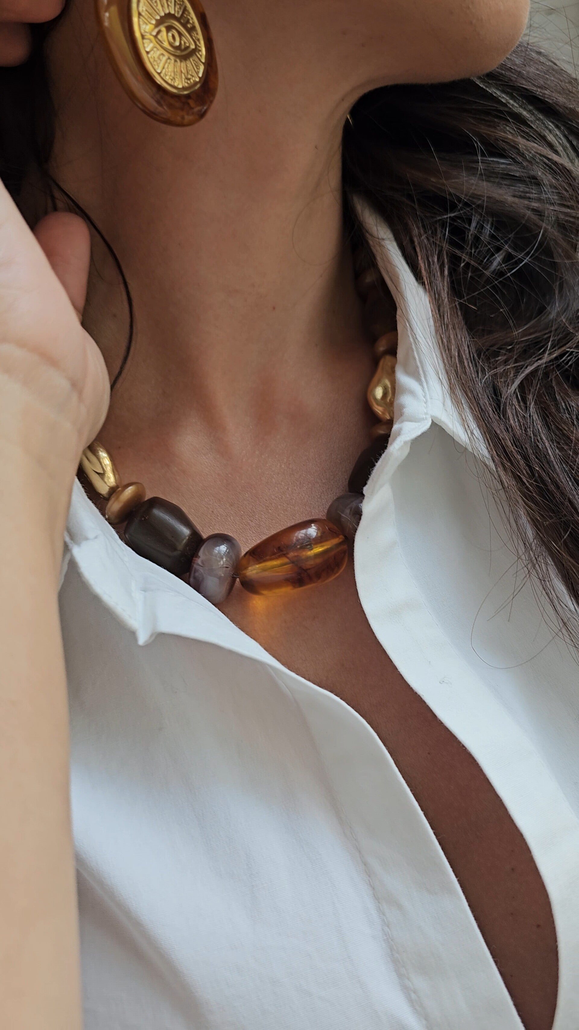 El Collar Robiño captura la esencia de los bosques en otoño: cálido, natural y lleno de matices tierra que conectan con lo esencial. Con una longitud de 45 cm, este collar está compuesto por una cuidada selección de piedras en tonos beige, marrón y tierra, evocando hojas secas, cortezas y luz dorada.