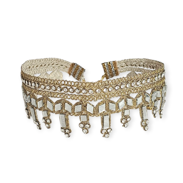 El Choker Brillantina es una pieza sofisticada y luminosa, diseñada en tela con destellos dorados que capturan la luz con cada movimiento. Su estilo elegante y vistoso lo convierte en el accesorio perfecto para bodas, ceremonias y ocasiones especiales, aportando un toque de brillo sutil y refinado.