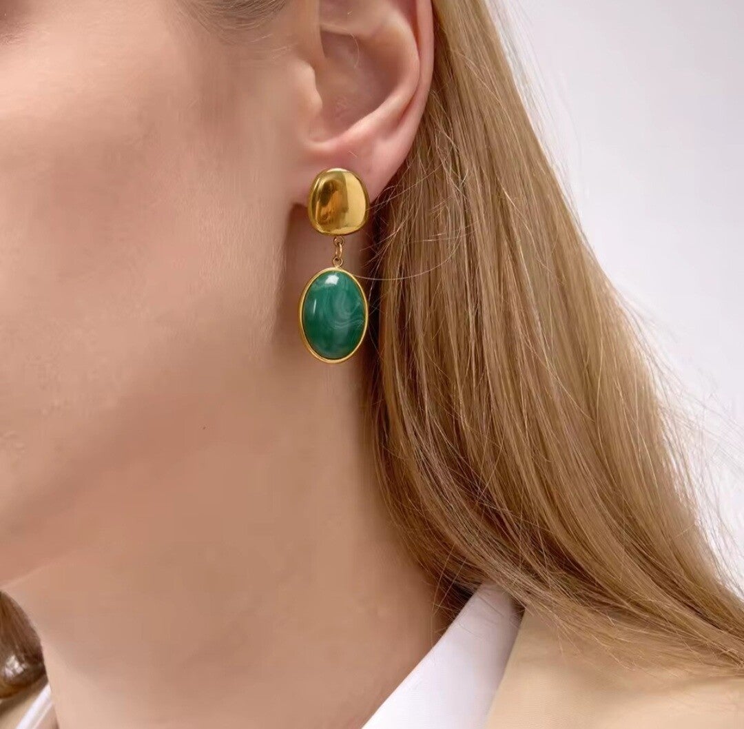 Los Pendientes Berna presentan un diseño ovalado en forma de gota, creado para ofrecer sofisticación y carácter con total sencillez. Fabricados en acero inoxidable, destacan por la piedra verde central, un detalle que aporta personalidad, frescura y un punto de luz único.