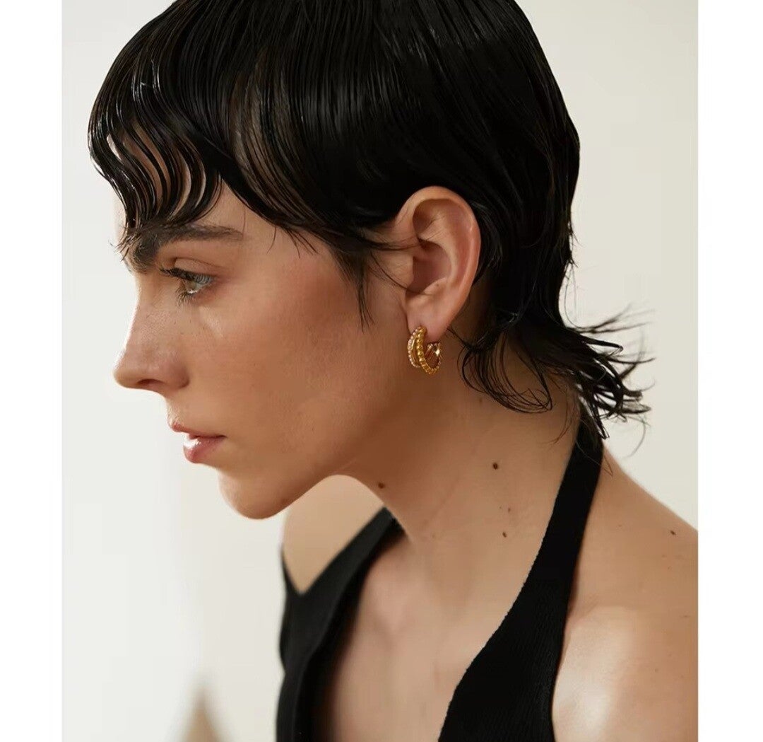 Los Pendientes Casilda son una joya moderna y elegante que combina aros geométricos en doble capa: una estructura en acero inoxidable chapado en oro de 18k y otra adornada con pequeñas perlas blancas. El contraste entre el metal suave y la textura perlada crea una pieza equilibrada, luminosa y con un encanto muy especial.